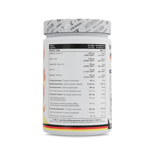 MST Beauty Fish Kollagen Verisol vereint Verisol® Kollagenpeptide aus Fisch mit Hyaluronsäure, Vitamin C, Zink, Biotin und Selen – ergänzt durch MSM, Curcuma- und Traubenkern-Extrakt sowie die Aminosäuren L-Lysin und L-Prolin. Ananas-Geschmack.