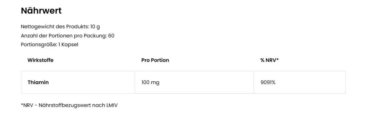 - ✅ 100 mg Thiamin pro Kapsel – 9091 % NRV.